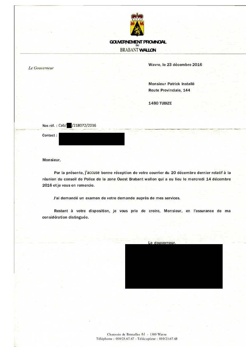 Par la présente, j'accuse bonne réception de votre courrier du 20 décembre dernier relatif à la réunion du conseil de Police de la zone Ouest Brabant wallon qui a eu lieu le mercredi 14 décembre 2016 et je vous en remercie.