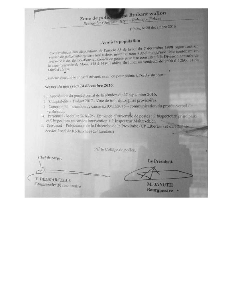 Pour votre bonne information vous trouverez ci-joint la copie de l’annonce d’un « bref exposé des délibérations du conseil de police». Ce qui confirme ma prédiction de l'impasse faite par la zone sur la régularité de la réunion.
